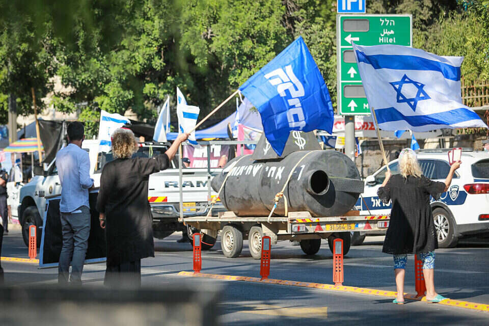תומכי נתניהו מביטים במודל של צוללת, שהכינו מתנגדיו, אוגוסט 2020. "שני הצדדים מדברים בשם הממלכתיות", צילום: אורן בן חקון