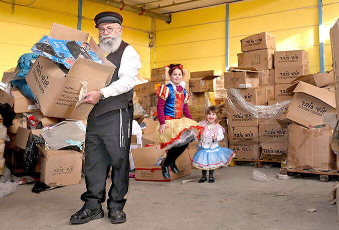 הרב גלויברמן עם שתיים מנכדותיו בתחפושות שחולקו בעמותת "יד ביד" | צילום: אפרת אשל