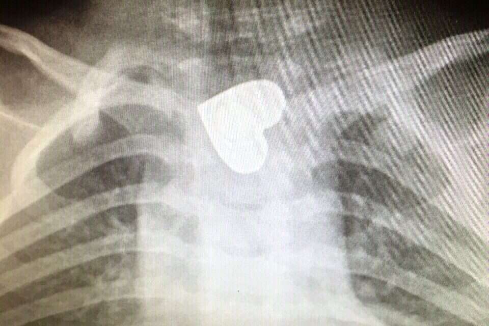 הילד נשלח לצילום שהראה כי הוא בלע כפתור בגודל של מטבע של חצי שקל וכי הכפתור נשאר בחלק התחתון של הוושט. גם הרופאים שכבר ראו הכל הופתעו לגלות בצילום את צורת הכפתור – לב.