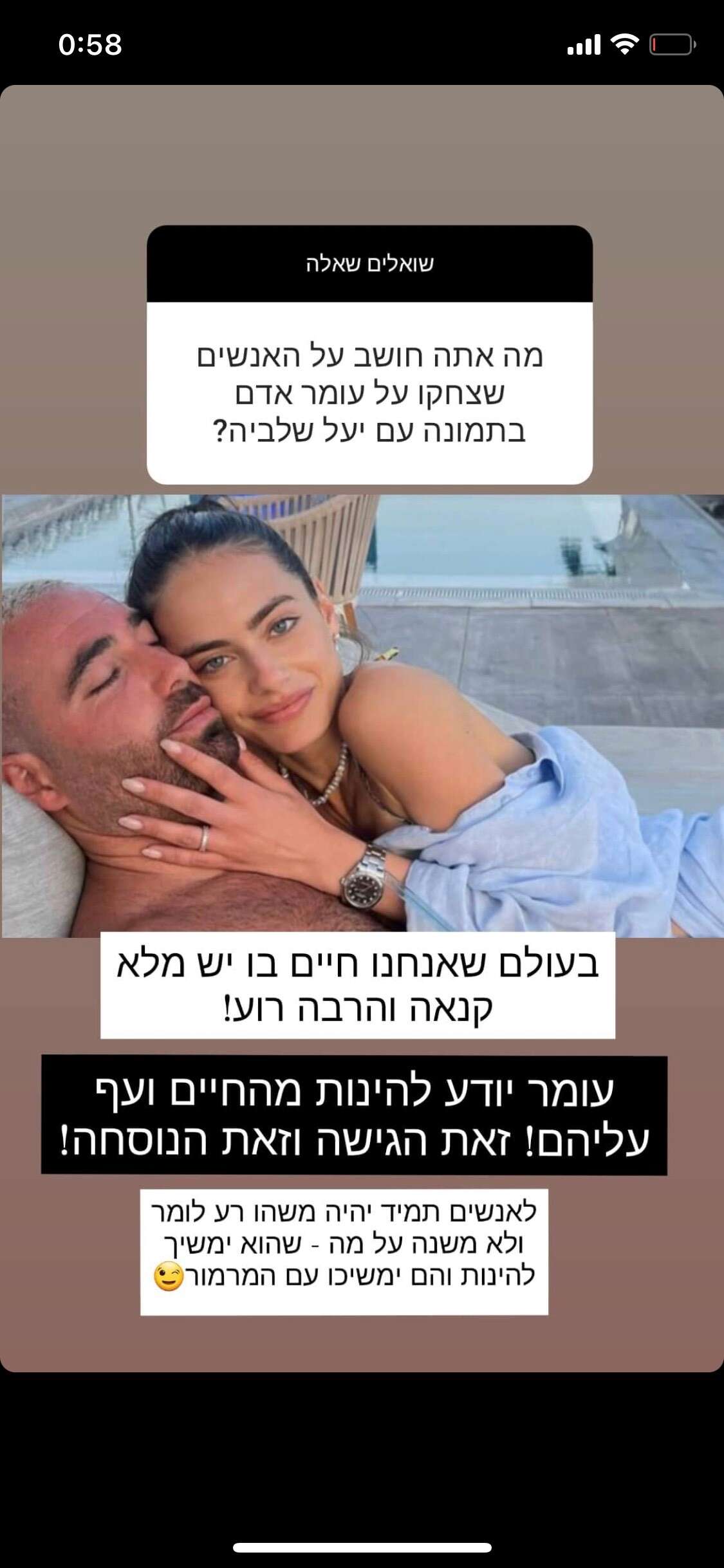 ״בעולם שאנחנו חיים יש מלא קנאה ורוע", כתב השורד בדימוס לעוקביו הנאמנים, "עומר יודע ליהנות מהחיים ועף עליהם. זאת הגישה! לאנשים תמיד יהיה מה לומר, שהוא ימשיך ליהנות והם ימשיכו עם המרמור״.