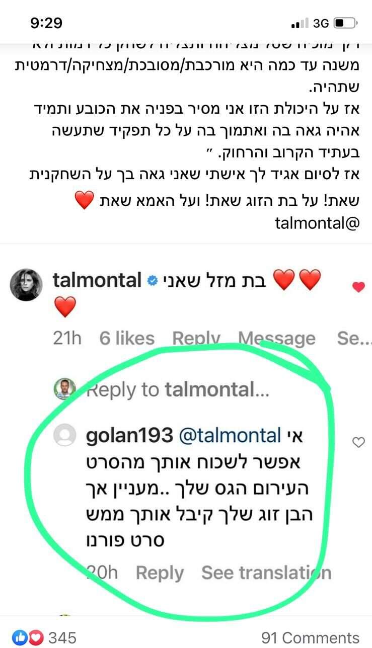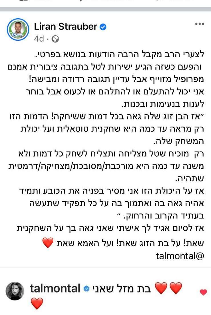 כאמור, שטראובר הגיב לארס של אותו גולש ורשם פוסט משלו. ״התגובה הזאת רדודה ומבישה, אני יכול להתלהם ולכעוס אבל בכנות אענה", כתב פרשן הכדורגל, "אני הבן זוג של טל, גאה בכל דמות ששיחקה, זה רק מראה כמה היא טוטאלית ותצליח בכל דמות ואתגר ולא משנה כמה מורכבת/מסובכת/מצחיקה/דרמטית שתהיה".