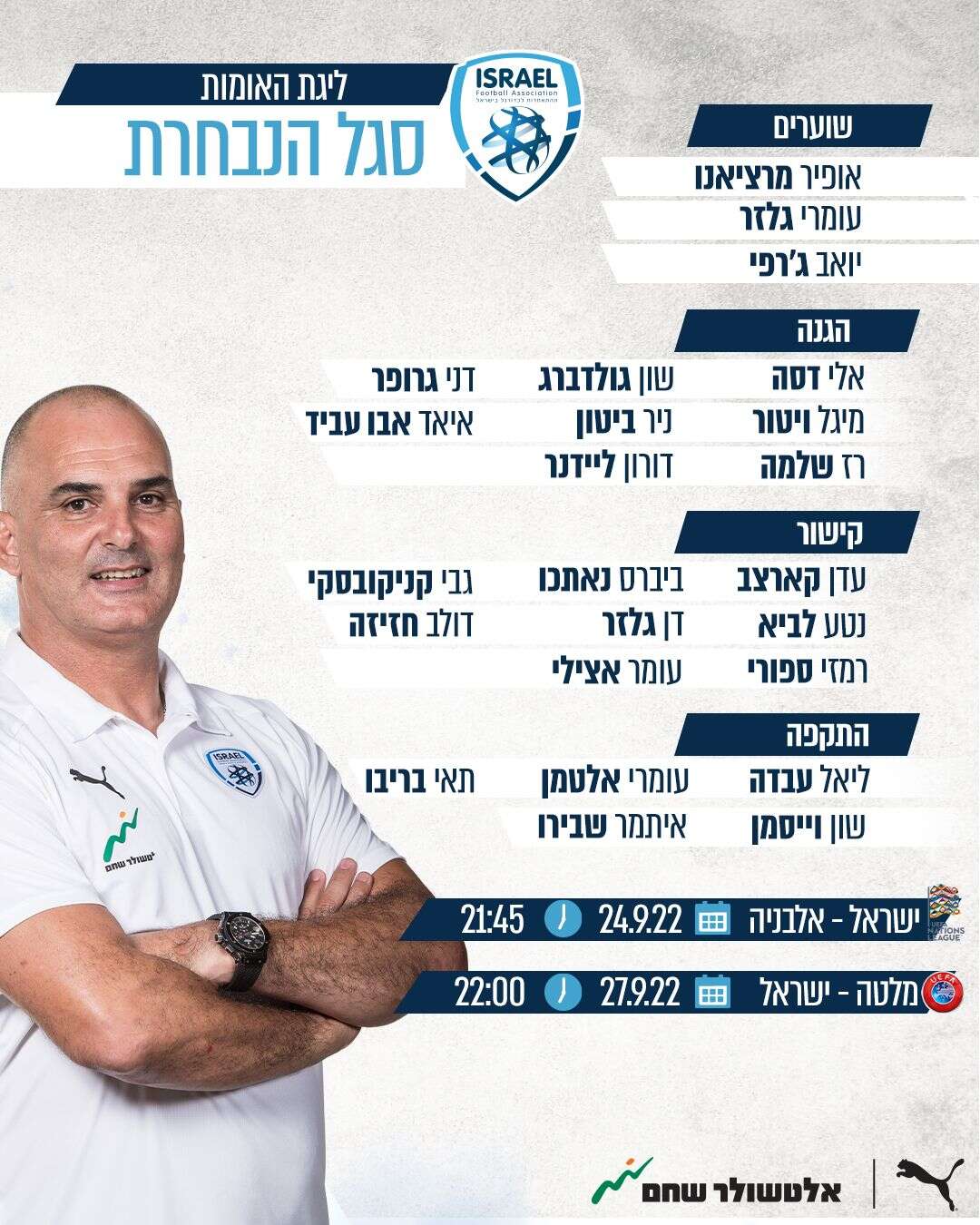 המאמן הלאומי אלון חזן, פרסם היום (חמישי) את הסגל המלא של נבחרת ישראל לקראת המשחק מול אלבניה במסגרת ליגת האומות במוצ"ש הבא. שלושה ימים מאוחר יותר, הנבחרת תצא למשחק חוץ במלטה.