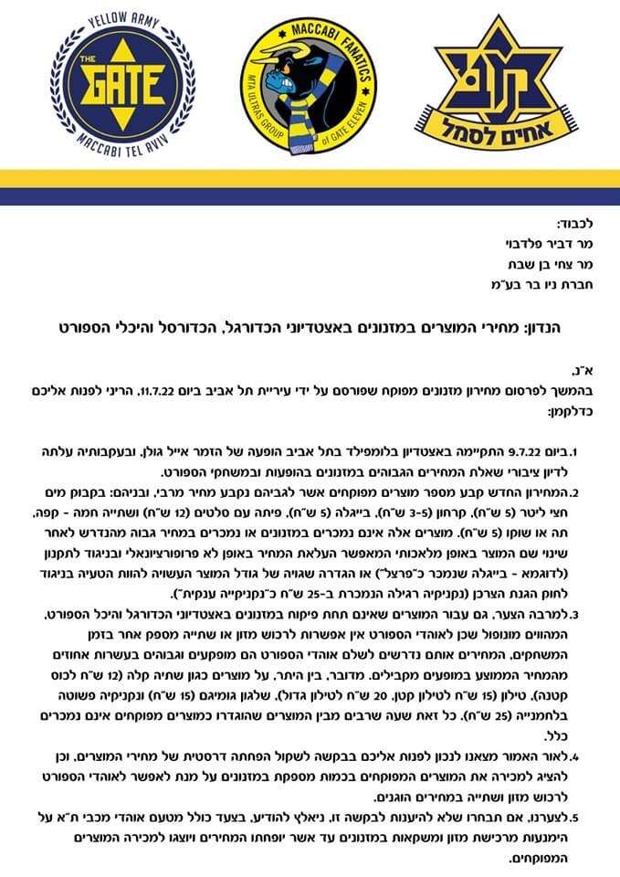 ״שלחנו מכתב למנהלי המזנונים בבלומפילד וביד אליהו והוא מצורף לעיונכם לצורך השקיפות. אם לא תהיה תגובה מצד בעלי המזנונים למחיר שמוסכם עלינו, ננקוט בצעדים נוספים״.
