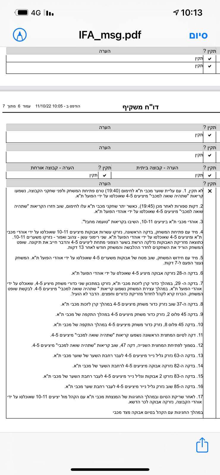 על פי דו"ח השיפוט, האדומים יעמדו לדין בגין השלכת עשרות אבוקות לכר הדשא מספר רב של פעמים, קריאות "שתהיה שואה למכבי", השלכת כדורים לעבר הרחבה במטרה לעצור את המשחק, השלכת גלילים וחפצים נוספים. הצהובים יעמדו לדין בשל השלכת אבוקות וקריאות "טועמה מחבל".