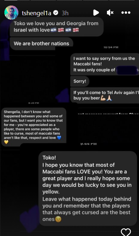 "לשחק בישראל היה תמיד עונג עבורי, בין אם זה במדי הקבוצות שלי נגד מכבי או במדי הנבחרת בתחרויות פיב"א", כתב הפורוורד הגאורגי, "תמיד קיבלו את פניי בחום והרגשתי את התמיכה של האוהדים הישראלים, שתמיד אהיה אסור תודה עליה".