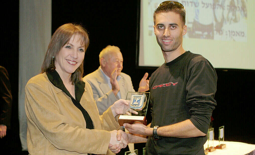 מה? שרת החינוך, התרבות והספורט מזנקת על זוכה מדליית הזהב במשחקים האולימפיים באתונה 2004, גל פרידמן, ועולה יחד איתו על הפודיום.