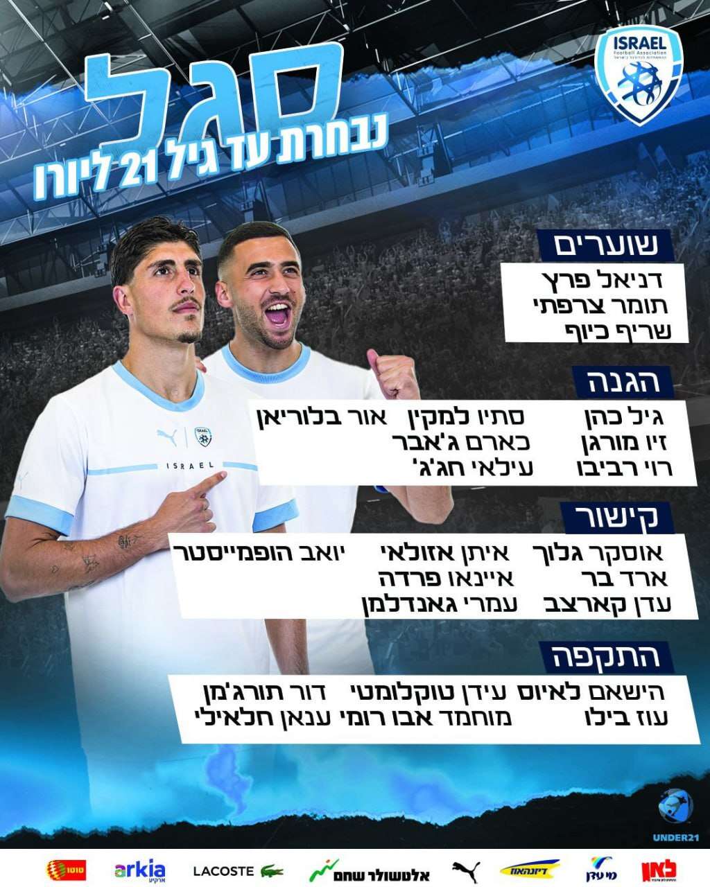 פורסם הסגל של הנבחרת הצעירה של גיא לוזון לטורניר אליפות אירופה עד גיל 21. השם הבולט הוא של אוסקר גלוך הכוכב מרד בול זלצבורג.