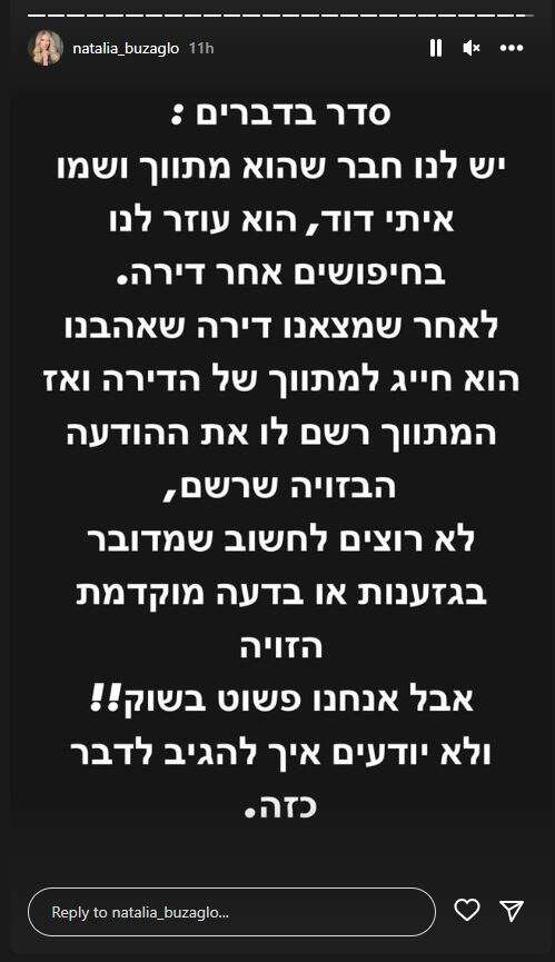 נטליה אמרה בשיחה עם "ישראל היום": "האמת שאנחנו המומים ומזועזעים, נפגענו מאוד. אנחנו מנסים עדיין להבין ולברר מאיפה זה נובע כי אנחנו שוכרים דירות המון שנים ולעולם לא הייתה לנו חצי בעיה עם בעלי דירות. להיפך".