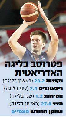 "יכול לעשות כמעט הכל"שתי החלטות משמעותיות קיבל פטרוסב בקיץ האחרון: לעזוב את מכללת גונזאגה ולהסיר את שמו מרשימת המועמדים לדראפט. את שני המהלכים האלה הוא עשה כדי להגביר את קצב ההתפתחות בחממה הגדולה של מגה באסקט. בינתיים הצעדים התגלו כמועילים מאוד. הוא רושם מספרים אדירים בליגה האדריאטית (ראו טבלה), וכאמור הוכיח את עצמו בגדול גם בנבחרת. "כל הסימנים מראים שהוא צדק בהחלטתו. הוא השתפר מאוד", אומר מילוייביץ', "משחקן שכמעט לא זורק לשלוש, הוא הפך לקלעי טוב מהטווח הזה. היום שחקן גבוה ברמות הגבוהות חייב את הזריקה מחוץ לקשת".