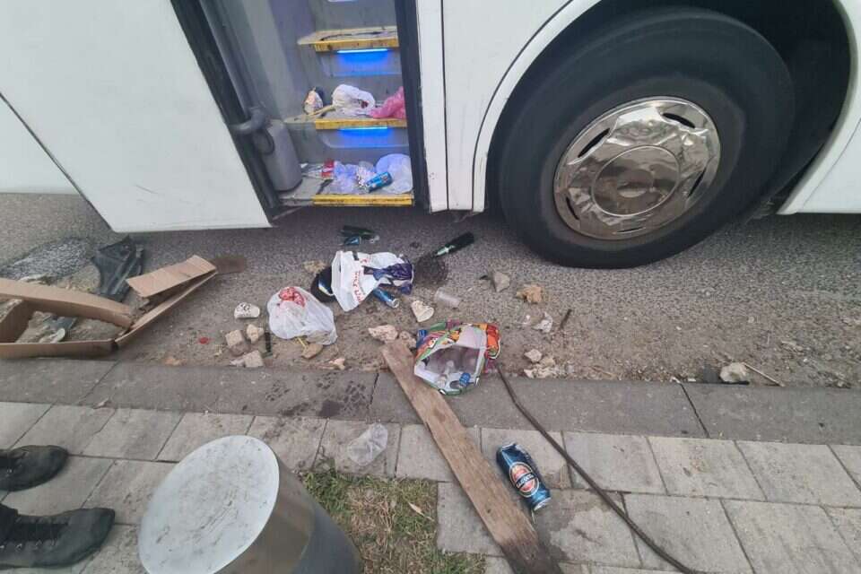 "בנוסף, בחיפוש מדוקדק שנערך באוטובוס האוהדים נמצאו אבנים וכלי תקיפה שונים שנתפסו על ידי השוטרים. כמו כן, שוטר שהיה במקום נפצע באורח קל במהלך הניסיון להפריד בין אוהדי 2 הקבוצות. 5 החשודים נעצרו כאמור ובסיום חקירתם ובהתאם לחומר הראיות בתיק יוחלט האם לבקש מחר את הארכת מעצרם".