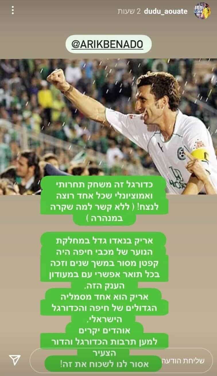 עוד הוסיף אוואט: "אריק בנאדו גדל במחלקת הנוער של מכבי חיפה, היה קפטן מסור במשך שנים וזכה בכל תואר אפשרי עם המועדון הענק הזה. אריק הוא אחד מסמליה הגדולים של חיפה והכדורגל הישראלי. אוהדים יקרים, למען תרבות הכדורגל והדור הצעיר, אסור לנו לשכוח את זה!".