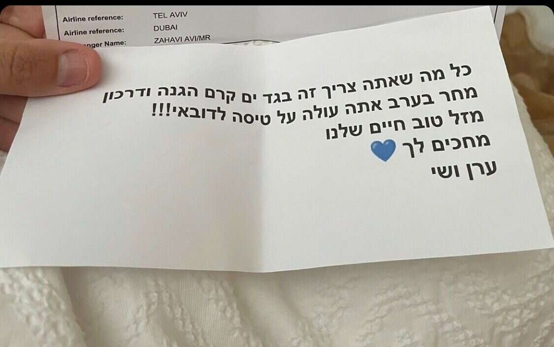 צמוד לכרטיס לדובאי צורף מכתב עם הכיתוב: ״כל מה שאתה צריך זה בגד ים וקרם הגנה. מחכים לך ערן ושי״. המדור שלנו מבטיח לכם תמונות של פס השיזוף של זהבי ובינתיים, תודו שזו מתנה מיוחדת במינה.