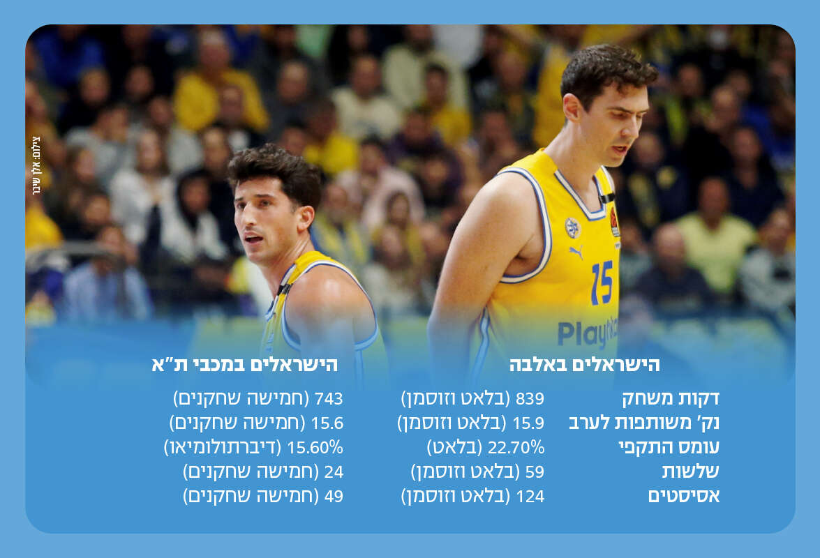 אם משקללים את כל דקות המשחק של שחקניה הישראלים של אלבה, המספרים אף ברורים יותר: בלאט וזוסמן שיחקו העונה 839 דקות משחק במצטבר. מנגד, כל שחקניה הישראלים של מכבי ת"א (חמישה שקיבלו דקות) שיחקו יחדיו 743 דקות.