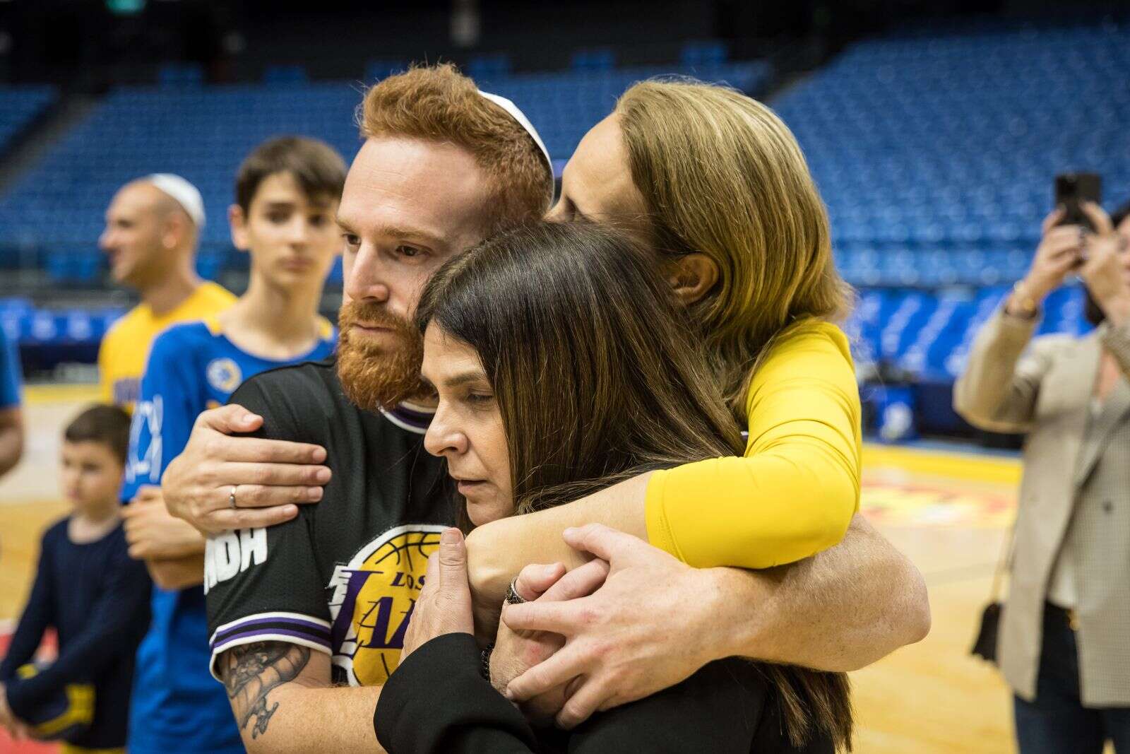 מכבי תל אביב חזרה לישראל לראשונה מזה חודשיים, ולקראת המפגש עם בני הרצליה הערב (שני) היא ניצלה את ההזדמנות לארח את טל וגל גולדשטיין אלמוג, שאיבדו את אביהם ואחותם ב-7 באוקטובר נחטפו לעז ושוחררו משבי החמאס. את אריאל זוהר בן ה-13 מניר עוז שהתייתם בשבת השחורה משני הוריו, ואת משפחת לביא, שבנם עומרי נרצח במסיבה הטבע "נובה". המשפחות צפו באימון, הצטרפו למשחק קצר עם השחקנים וקיבלו מתנות.