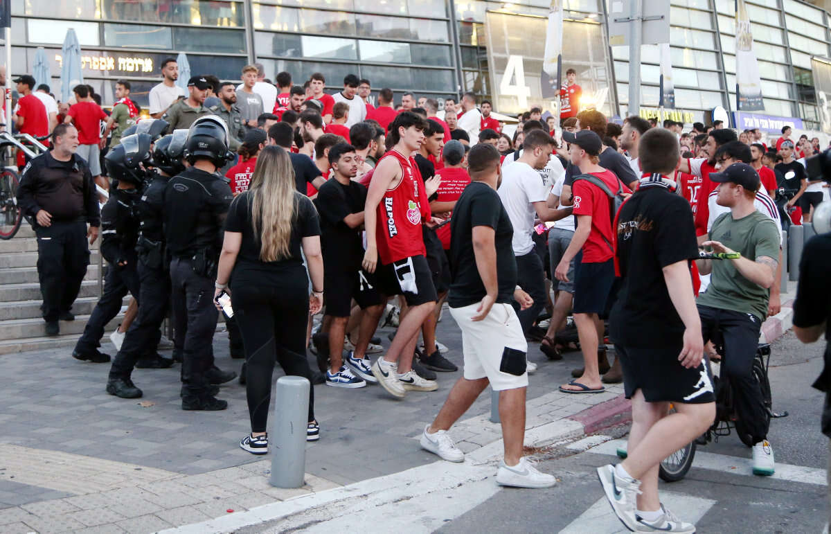 במסגרת ההיערכות של המשטרה לאבטחה של האוהדים ושמירה על הסדר הציבורי, נתקלו השוטרים בתהלוכה לא מאושרת של אוהדי הפועל ת"א בסמוך להיכל מנורה, כאשר הם קוראים קריאות פוגעניות כלפי השוטרים "המשטרה בני ז***ת".