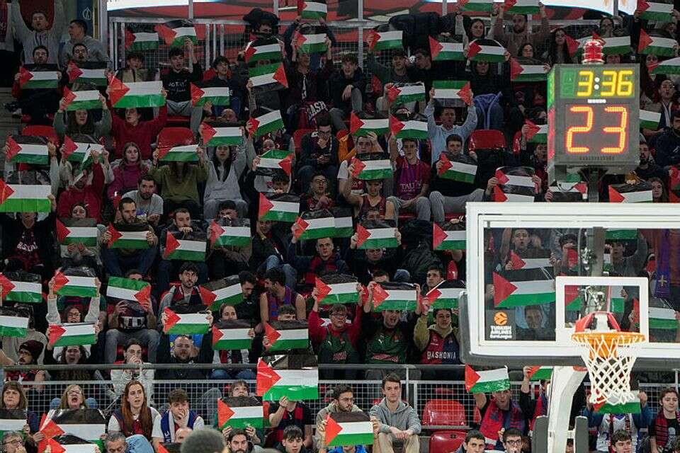 ארגון האוהדים "אינדאר באסקוניה" שבימים כתיקונם יושב מאחורי הסל, הותיר ברבע הראשון את היציע ריק מאנשים ועם דגל פלשתין פרוס על פני כמה מהכיסאות בו. הארגון קרא לפני המשחק לשאר יושבי האולם לא להיכנס למשחק ברבע הראשון אלא רק לאחריו, ואז "להביע את התנגדותו" לנוכחותה של מכבי תל אביב.