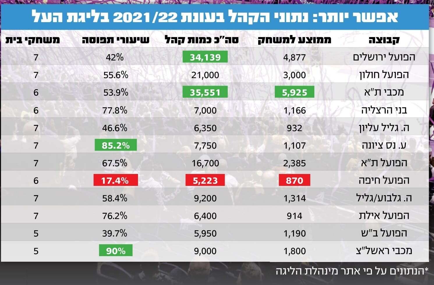3. בשנתיים האחרונות לא היתה כניסת קהל למגרשים בצורה סדירה, ולכן לא ביצענו השוואה לעומת העונות הקודמות. כמו כן, אנחנו עדיין רק בחלק הראשון של העונה, ויש הבדלים בכמות משחקי הבית בין הקבוצות, כמו גם בזהות היריבות באותם משחקים. ישנן גם קבוצות שהוזילו משמעותית את עלות הכרטיסים או אפילו מכניסות בחינם בני נוער ומגזרים נוספים.