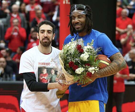 אמארה מקבל את הפרחים מבר טימור, הערב בארנה // צילום: אלן שיבר