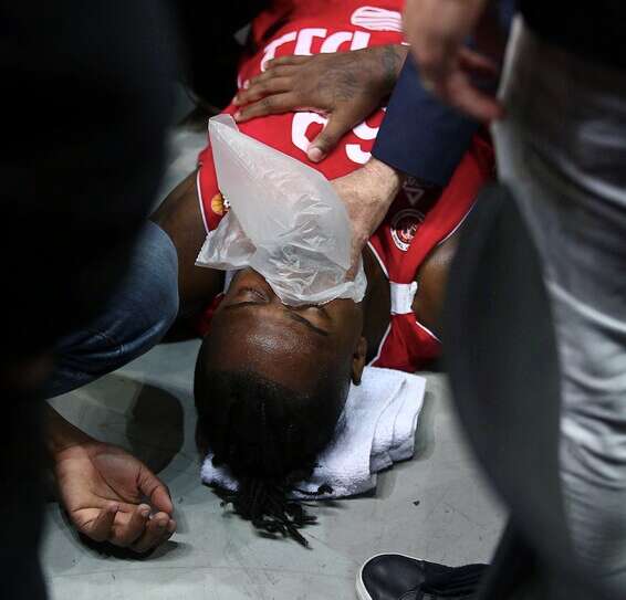 בראון מקבל חמצן על הפרקט  // צילום: אלן שיבר