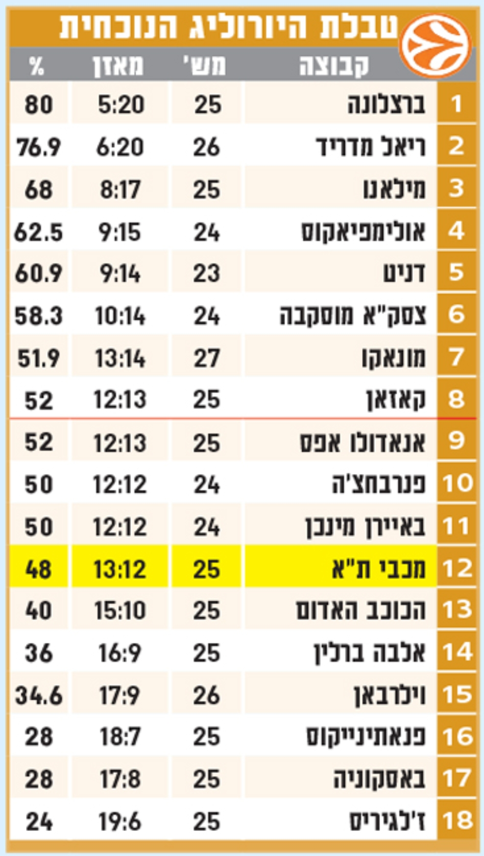 באיירן מינכן, שהפסידה בשלושת משחקיה לרוסיות, תוקפץ מהמקום ה־11 למקום החמישי(!), מכבי ת"א (מאזן 3:1 מול הרוסיות) תזנק למקום השביעי, והשיא: ז'לגיריס קובנה, נמושת היורוליג העונה (4:0) והאחרונה בטבלה, פתאום הרוויחה סיכוי תיאורטי לעלות לפלייאוף. לליטאים יש עוד שבעה משחקים (חמישה בבית ומשחק חוץ בוויטוריה, שבו הם בהחלט יכולים לנצח). בחסות "פוטין", פתאום הם מגלים שיש להם על מה להיאבק העונה.