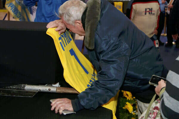 טל ברודי עם צביקה שרף, היום בהיכל מנורה. כבוד אחרון לשמלוק // צילום: אלן שיבר
