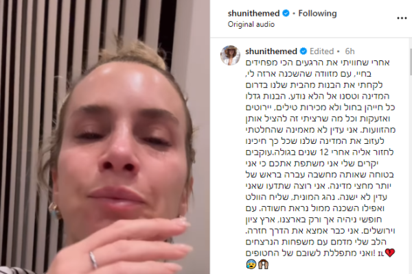 "אחרי שחוויתי את הרגעים הכי מפחידים בחיי, עם מזוודה שהשכנה ארזה לי, לקחתי את הבנות מהבית שלנו בדרום המדינה וטסנו אל הלא נודע. הבנות גדלו כל חייהן בחול ולא מכירות טילים, יירוטים ואזעקות וכל מה שרציתי זה להציל אותן מהזוועות", כתבה שונית. "אני עדיין לא מאמינה שהחלטתי לעזוב את המדינה שלנו שכל כך חיכינו לחזור אליה אחרי 12 שנים בגולה. עוקבים יקרים שלי אני משתפת אתכם כי אני בטוחה שאותה מחשבה עברה בראש של יותר מחצי מדינה. אני רוצה שתדעו שאני עדיין לא ישנה. נהג המונית, שליח הוולט ואפילו השכנה ממול נראית חשודה. עם חופשי נהיה אך ורק בארצנו, ארץ ציון וירושלים. אני כבר אמצא את הדרך חזרה. הלב שלי מדמם עם משפחות הנרצחים ואני מתפללת לשובם של החטופים!".