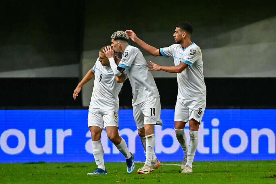 שחקני נבחרת ישראל ותושבי העוטף שרים את ההמנון בהונגריה | ליאב נחמני