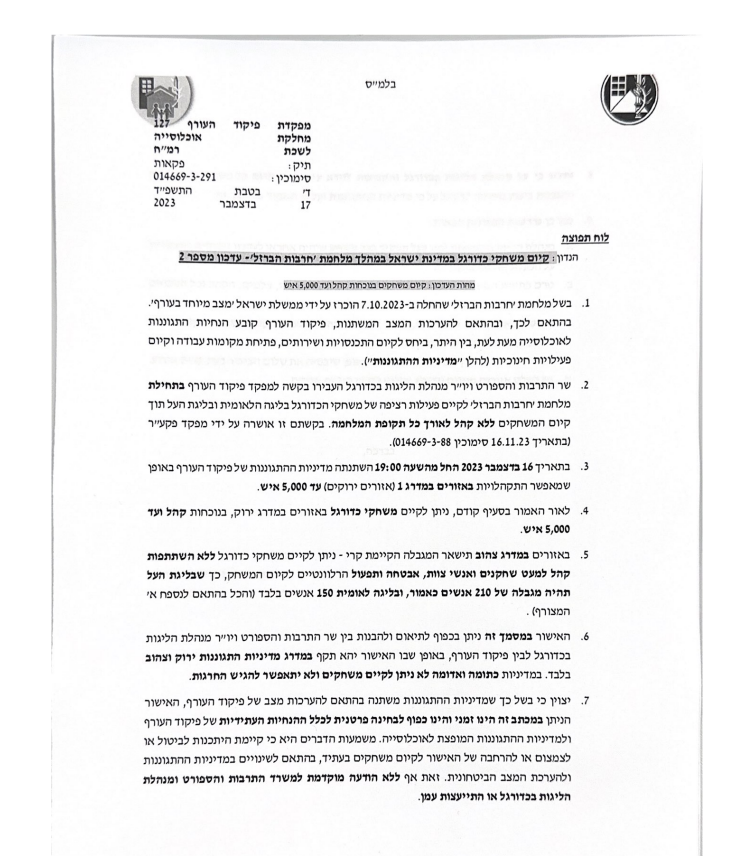 מדינת ישראל, ויחד איתה הספורט הישראלי, מתחילים לאט לאט לחזור לסוג של שגרה, אתמול (שבת) שינה פיקוד העורף את הנחיותיו ואישר לראשונה מאז פתיחת המלחמה התכנסות של 5000 איש במגרשי הכדורגל והכדורסל. באולמות הכדורסל כבר נערכו משחקים עמוסי קהל הערב, ובהמשך השבוע גם צופי הכדורגל יזכור לחזור ולראות את קבוצותיהם מקרוב, אבל מה עושים במקרה שבכל זאת תישבע אזעקה? ולמה הקבוצות צריכות לדאוג בטרם המשחק?