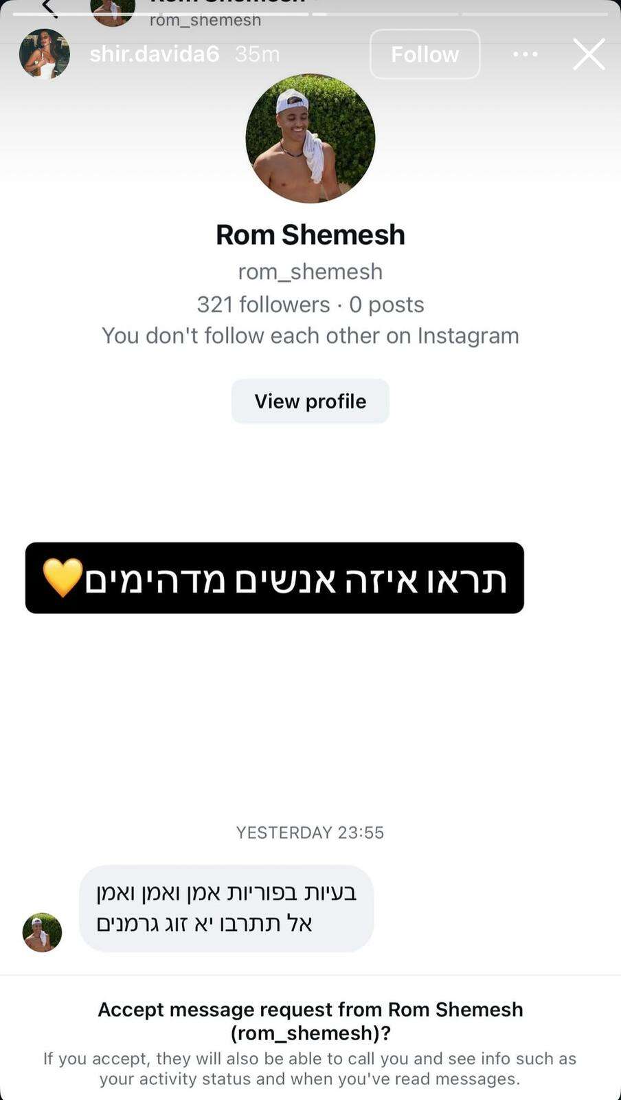 באחת ההודעות, שנשלחה לשיר מצד אוהד הפועל בשם רום שמש, נכתב כך: "בעיות בפוריות אמן ואמן ואמן. אל תתרבו יא זוג גרמנים", בעוד על כך הגיבה שיר בסטורי: "תראו איזה אנשים מדהימים", והוסיפה אימוג'י לב צהוב.