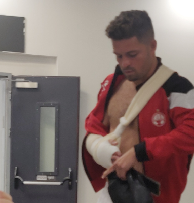 צילום: עוזי ניסים // דוד קלטינס עם היד המגובסת. ניתוח בשבוע הבא