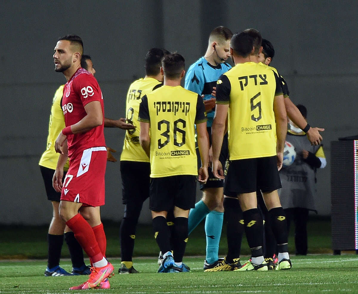 צילום: ברני ארדוב // שחקני נתניה מקיפים את פריד, הערב