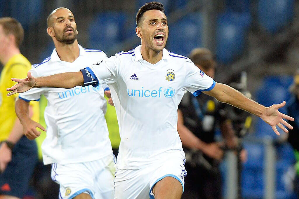 ערן זהבי וגל אלברמן חוגגים מול באזל במדי מכבי תל אביב. הרגע הגדול במועדון, צילום: EPA