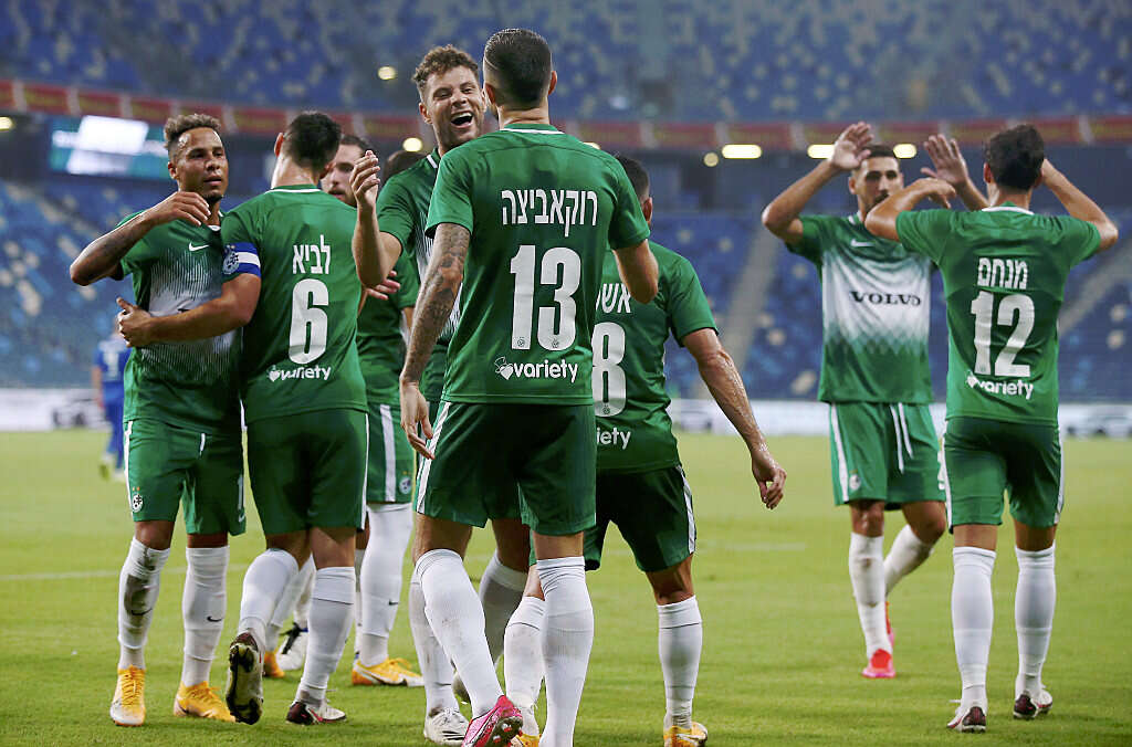 שחקני מכבי חיפה חוגגים בסמי עופר. המשימה הבאה כבר ביום ראשון // צילום: אלן שיבר