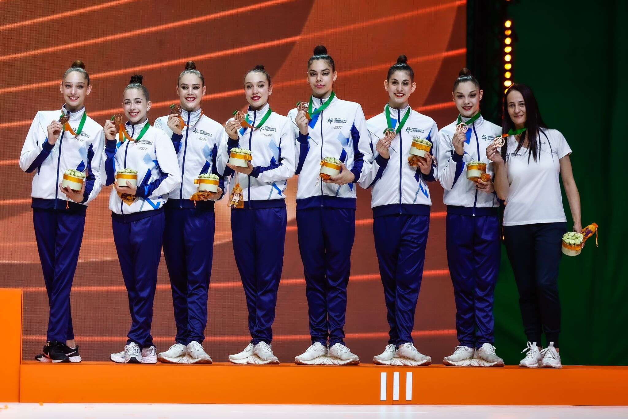 נבחרת ההתעמלות שזכתה באליפות העולם האחרונה עם רומי פריצקי, דיאנה סברצוב, אופיר שחם, שני בקנוב והדר פרידמן יעלו אחרונות בסבב לתרגיל חמשת החישוקים, וכך גם יקרה בתרגיל המשולב.