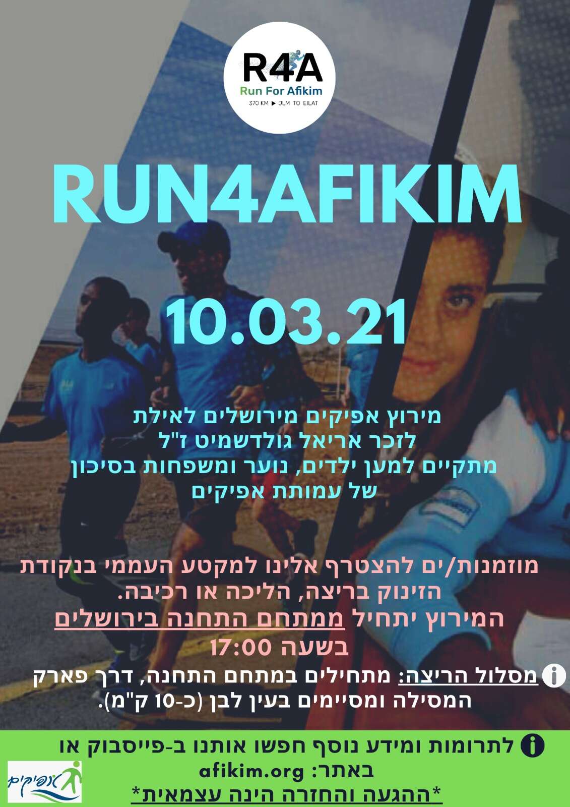 מחר (17:00) יוזנק מירוץ אפיקים (מירושלים לאילת) לזכרו של אריאל גולדשמיט ז"ל. מעל 100 רצים יקחו חלק במירוץ, הכל כמובן על פי התו הירוק, והם יעברו לא פחות מ-370 ק"מ במשך שלושה ימים.