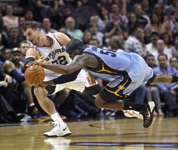 זאק רנדולף וטיאגו ספליטר במאבק על הכדור. הספרס ניצחו // צילום: אי.פי