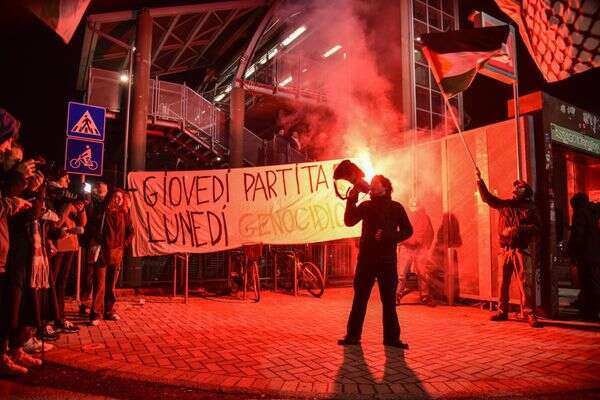 עשרות פרו פלשתינים התקבצו הערב (חמישי) מחוץ לאולם "מדיולאנום פורום" של אולימפיה מילאנו לפני המשחק מול הפועל תל אביב במסגרת היורוליג. המפגינים הניפו שלטים נגד ישראל, הדליקו אבוקות וקראו להחרים את הקבוצות שלנו מהספורט העולמי בעקבות המלחמה בעזה.
