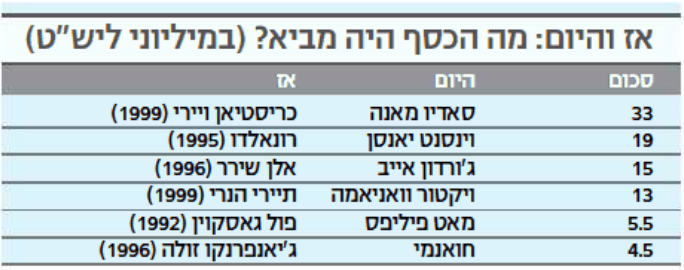 רף 30 המיליון. ב־2001 חואן סבסטיאן ורון נקנה על ידי מנצ'סטר יונייטד ב־28 מיליון ליש"ט, ושנה אחר כך השדים האדומים שילמו ללידס 29 מיליון עבור ריו פרדיננד. עשור אחורה, רק רוביניו, אנדריי שבצ'נקו וקרלוס טבס חצו את גבול 30 המיליון, ואפילו לפני חמש שנים הסכום הזה היה נקודת שפיות שאותה עברו רק סיטי עם קון אגווארו, צ'לסי בהחתמה של פרננדו טורס וליברפול שהתרסקה עם אנדי קארול. לואיס סוארס, אגב, עלה רק 22 מיליון.
