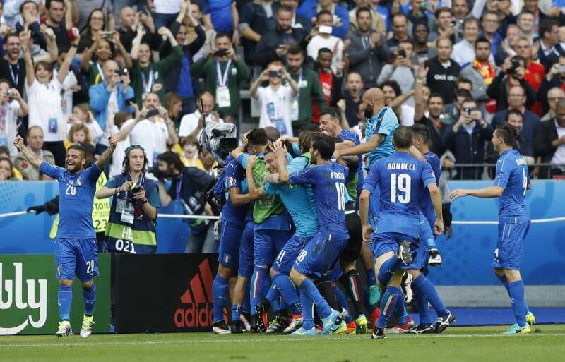 שחקני איטליה חוגגים את השער השני מול ספרד // צילום: אי.פי