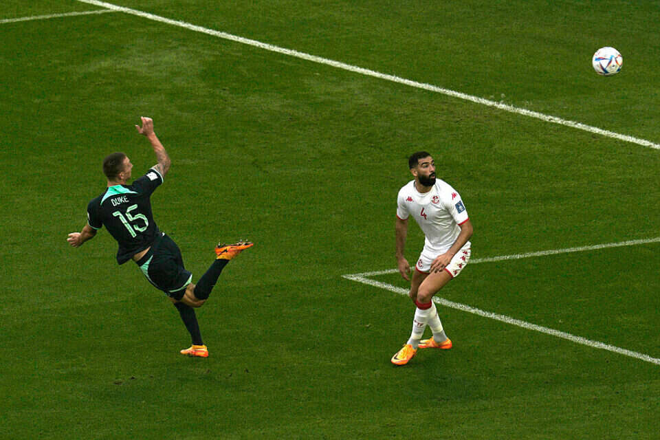 מיטשל דיוק האוסטרלי התרומם נהדר להגבהה של קרייג גודווין (כובש השער מול צרפת) ונגח פנימה את שער היתרון, שהפך גם לתוצאת המחצית - 0:1 לאוסטרליה.
