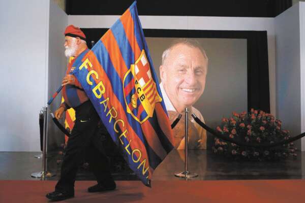 צילום: אי.פי // אוהד ברצלונה ודיוקנו של יוהאן קרויף. הותיר מורשת נכבדת