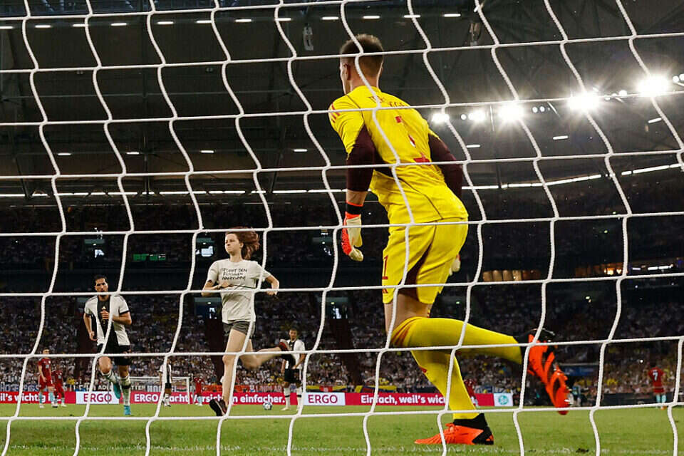 שני אוהדים פרצו לכר הדשא ורצו לעבר השער של מארק טר שטגן הגרמני, במטרה לכבול את עצמם לקורות השער. האוהד הראשון החליק בדרך ונעצר על ידי מאבטח, בעוד האוהדת שלאחר מכן כמעט והצליחה במשימה שלה, אך טר שטגן מנע ממנה לעשות זאת.