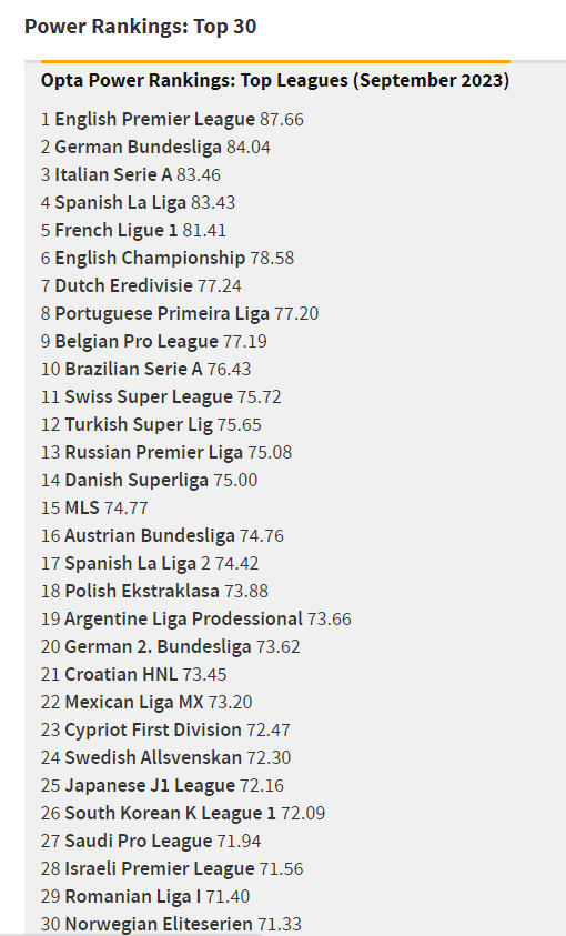 למרות הכוח העולה שלה, הליגה הסעודית עדיין רחוקה מהליגות הטובות בעולם ולפי הנתונים העדכניים ביותר של Opta, היא מדורגת במקום ה-27 בטופ 30. הפרמייר ליג היא הליגה הדומיננטית בעולם מה שלא מפתיע לאור העובדה כי בשנים האחרונות, קבוצות הצמרת האנגליות החלו להתרחק מהקבוצות הגדולות בליגות האירופיות הבכירות האחרות, בגלל העושר העצום של הליגה והמועדונים החברים בה. הדומיננטיות הזו נראתה בתחרויות באירופה בשנים האחרונות. בחמש מתוך שש העונות האחרונות, הייתה קבוצה אנגלית שהתחרתה בגמר ליגת האלופות עם שלושה זכיות של קבוצות אנגליות. מנצ'סטר סיטי זכתה במפעל הבכיר באירופה בפעם הראשונה אי פעם בעונה שעברה והיא הקבוצה החזקה באירופה כרגע.