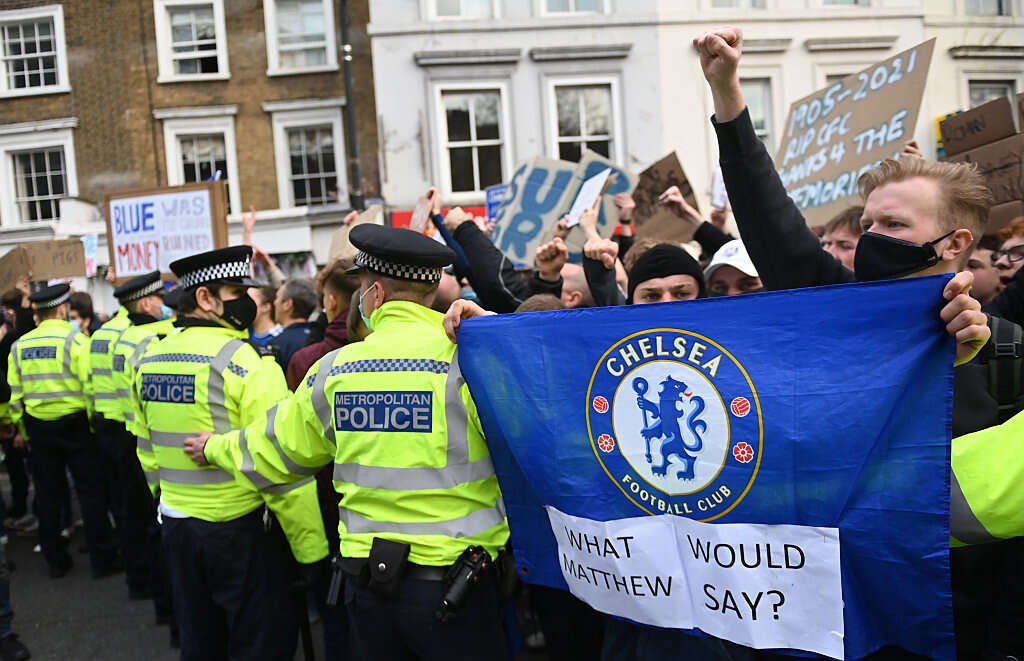 מחוץ לאצטדיון סטמפורד ברידג' בלונדון, אוהדי צ'לסי שהגיעו כדי למחות נגד הצטרפות הקבוצה לסופר ליג, חגגו כאשר החלו להגיע הפרסומים בכלי התקשורת על המהלך של המועדון.