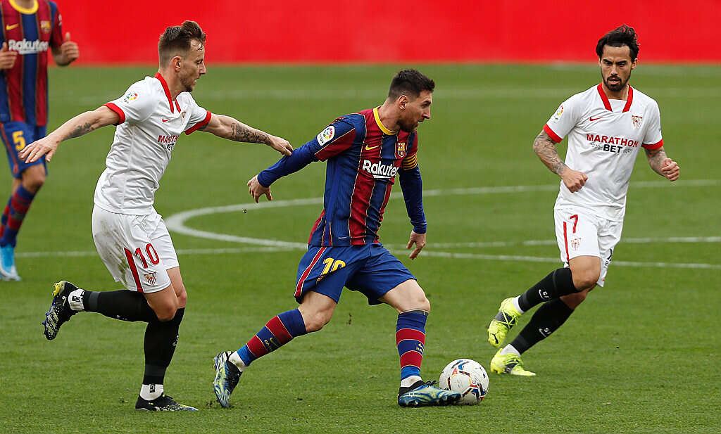 צילום: אי.פי // מסי בין סוסו לראקיטיץ'. הפרעוש אוהב לפגוש את סביליה