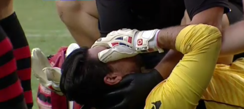 השוער הישראלי נפגע בברכו בדקה ה-34 לאחר שעלה לכדור גובה ממנו נחת בצורה רעה מאוד על רגלו ומיד פונה לבית החולים כדי לטפל טיפול לאחר שאיבד את הכרתו על הדשא.