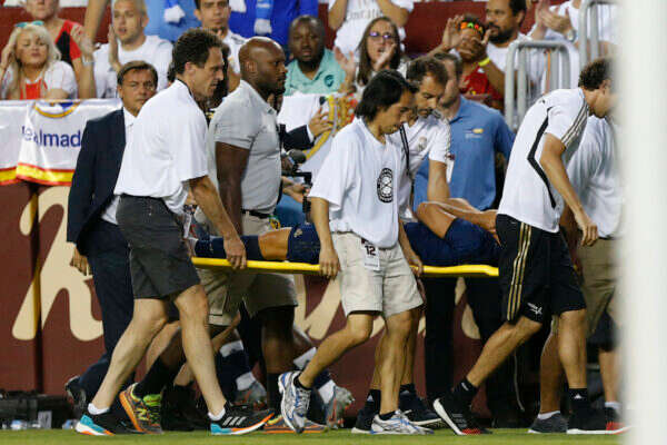 צילום: USA today sports // אסניסיו מפונה באלונקה לבית החולים