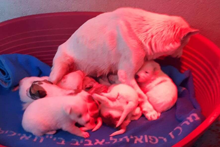 תושבת שכונת גילה בירושלים התקשרה ביום חמישי שעבר למוקד אגודת צער בעלי חיים בישראל (4553*)  ודיווחה על כלבה מפוחדת ומבוהלת, אמא לשישה גורים בני כמה ימים כשלצידה מתרוצץ עוד כלב קטן נוסף, כנראה גור שנשאר לצדה מהמלטה קודמת.