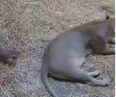 בתוך מתחם האריות בגן החיות של באדינבורו, סקוטלנד ישבה הלביאה בנוחות וצפתה באחד הגורים שלה. בינתיים, גור נוסף התגנב בשקט מאחורי אמו והתנפל עליה.