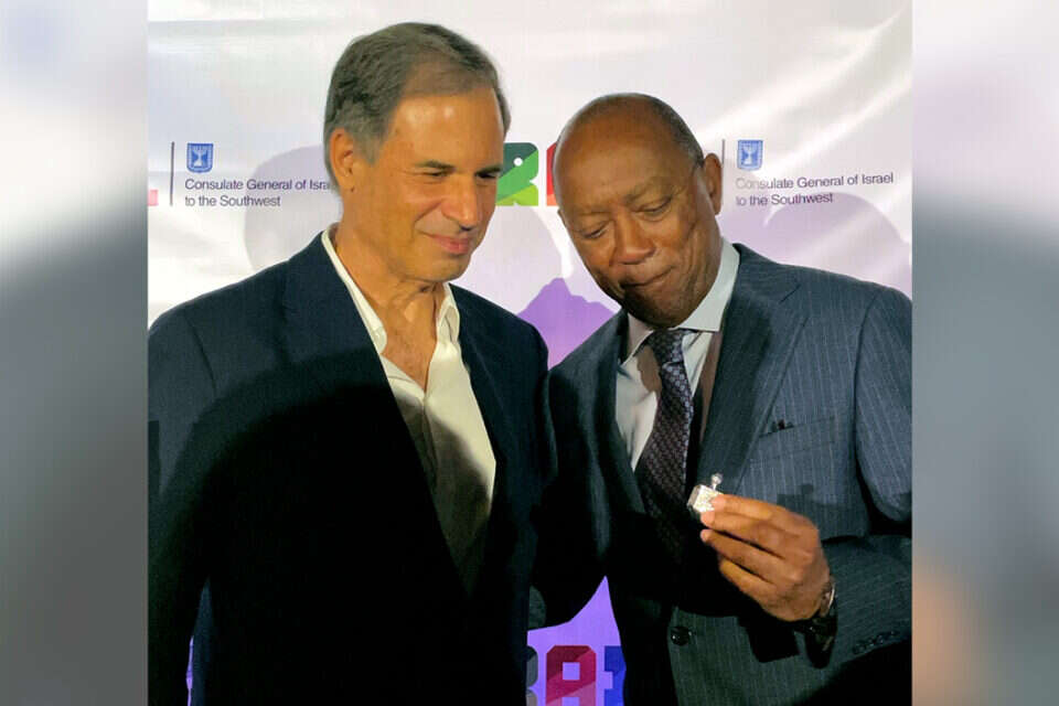 בהדלקת נרות בקונסוליה הישראלית ביוסטון, טקסס, העניק סטיבה לראש העיר סילבסטר טרנר סביבון.